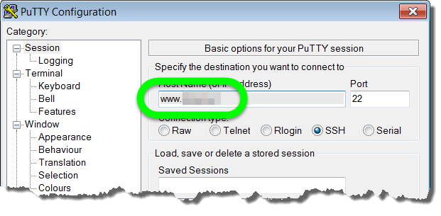 Das Fenster PuTTY Configuration wird angezeigt.
